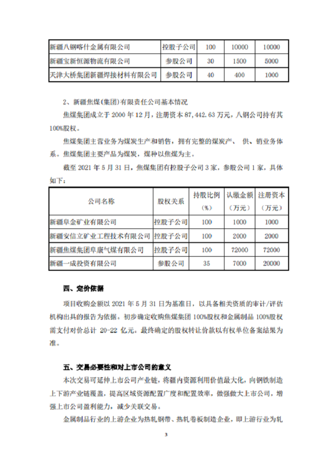 八一鋼鐵擬收購新疆八鋼金屬制品有限公司、新疆焦煤(集團)100%股權