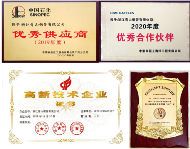 青山鋼管自成立起,就始終致力于為全球客戶提供優質的產品和專業的服務,一直專注不銹鋼管道產品的生產、銷售、研發,憑著母公司的品牌影響力、先進的生產設備和生產工藝、優質的產品和服務,先后成為諸多知名企業的合格供應商或合作伙伴。近幾年公司陸續榮獲“國家高新技術企業”“2020年中石化不銹鋼框架采購協議單位”“天俱時工程科技集團2019年度優秀供應商”“青田縣第四屆縣政府質量獎企業”“浙江名牌產品” “2020年度中國不銹鋼管材優質品牌獎”“中集來福士集團2020年度優秀合作伙伴”“東方汽輪機有限公司2020年度供應商質量Q1獎”等榮譽。
