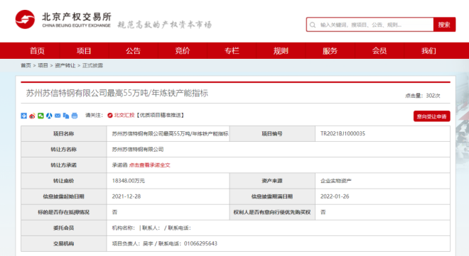 江蘇蘇鋼集團(tuán)有限公司下屬蘇州蘇信特鋼有限公司55萬噸/年煉鐵產(chǎn)能指標(biāo)已于2021年12月28日在北京產(chǎn)權(quán)交易所公開掛牌轉(zhuǎn)讓,歡迎符合《鋼鐵行業(yè)產(chǎn)能置換實(shí)施辦法》規(guī)定的意向單位垂詢并參與競買。