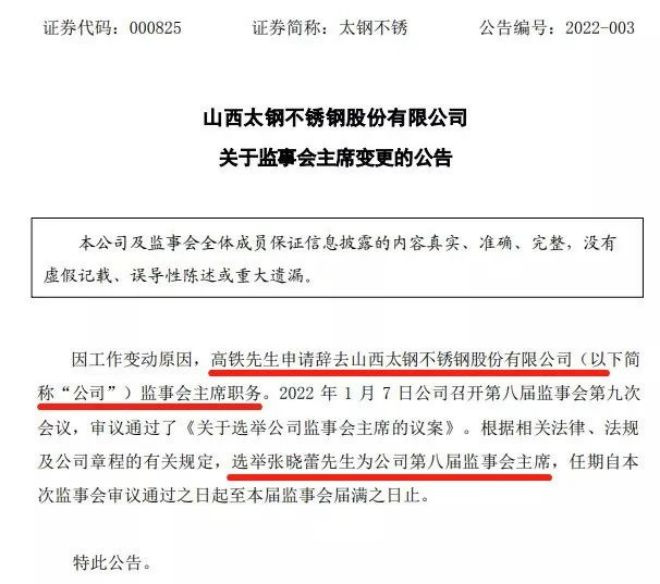 ·太鋼不銹監(jiān)事會(huì)主席高鐵辭職 選舉張曉蕾為監(jiān)事會(huì)主席