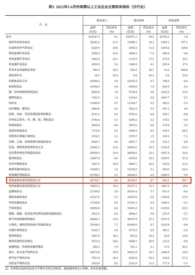 7月27日,國家統計局發布數據顯示,2022年1—6月,黑色金屬冶煉和壓延加工業實現營業收入45759.7億元,同比下降3.6%;營業成本43326.5億元,同比增長0.7%;實現利潤總額826.1億元,同比下降68.7%。