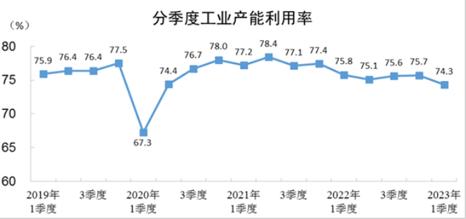一季度,全國工業產能利用率為74.3%,比上年同期下降1.5個百分點,比上季度下降1.4個百分點。