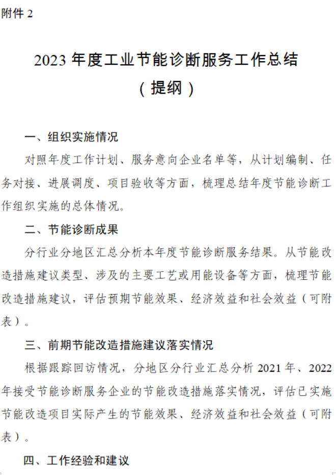 (四)報送工作總結。推薦單位在任務完成后,應從診斷數(shù)量、完成質量、數(shù)據(jù)分析、企業(yè)反饋等方面對工業(yè)節(jié)能診斷服務進行全面梳理總結,于2023年12月31日前將工作總結報告(見附件2)報送工業(yè)和信息化部(節(jié)能與綜合利用司)。