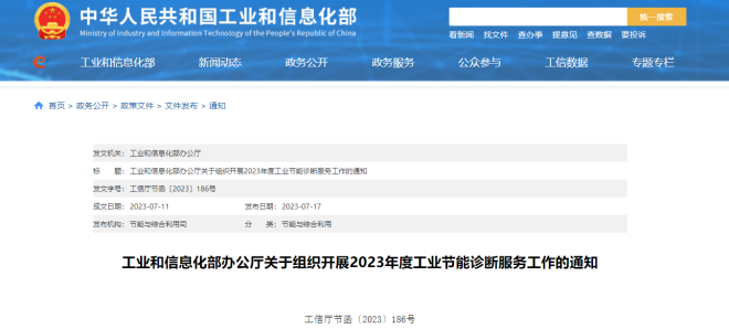 7月17日,工信部發(fā)布《關于組織開展2023年度工業(yè)節(jié)能診斷服務工作的通知》(以下簡稱《通知》)。