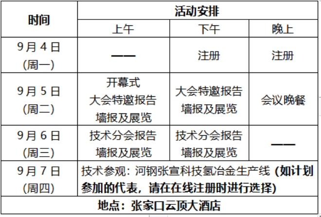 為了使本屆氫冶金國際研討會成功召開,國內各有關單位領導和氫冶金科技工作者對于此次會議給予了重視和支持,付出了努力,共組織撰寫了60余篇優質的論文,展現出我國氫冶金領域取得的成績和科技進步。通過該系列國際學術交流平臺,定將促進我國氫冶金科技人員和國外同行的交流,學習和借鑒國外同行的先進技術和經驗。希望各有關單位能充分利用這次難得的機會,組織人員踴躍參加會議并積極參與學術交流活動。會議有關事項通知如下: