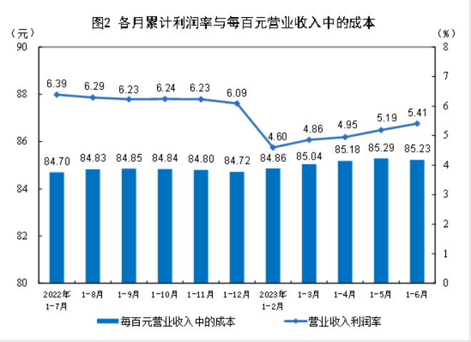 1—6月份,規模以上工業企業實現營業收入62.62萬億元,同比下降0.4%;發生營業成本53.37萬億元,增長0.5%;營業收入利潤率為5.41%,同比下降1.07個百分點。