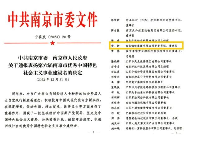 2024年1月2日,新年第一個工作日,南京市民營經濟高質量發展推進大會召開。南京市委書記韓立明講話,市長陳之常主持,市人大常委會主任龍翔、市政協主席王立平、市委副書記沈文祖、江蘇省委統戰部常務副部長顧萬峰出席。會議通報表揚了“第六屆南京市優秀中國特色社會主義事業建設者”,作為南京市排名第一的企業,南鋼黨委書記、董事長黃一新獲此殊榮。
