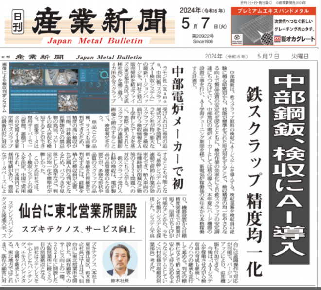 2024年5月7日,日本鋼鐵行業(yè)權(quán)威媒體“鋼鐵新聞”、“產(chǎn)業(yè)新聞”以及“日本市況通信日刊”等媒體重點(diǎn)報(bào)道了日本中部鋼板株式會(huì)社引入鐳目廢鋼智能判級(jí)系統(tǒng)的新聞。