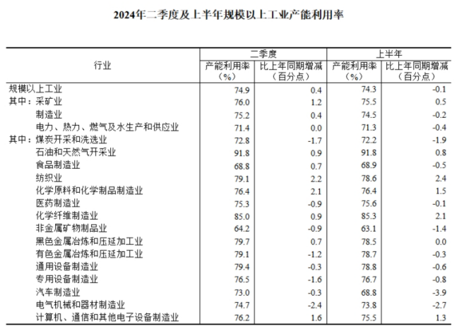 分主要行業看,2024年二季度,煤炭開采和洗選業產能利用率為72.8%,食品制造業為68.8%,紡織業為79.1%,化學原料和化學制品制造業為76.4%,非金屬礦物制品業為64.2%,黑色金屬冶煉和壓延加工業為79.7%,有色金屬冶煉和壓延加工業為79.1%,通用設備制造業為79.4%,專用設備制造業為76.5%,汽車制造業為73.0%,電氣機械和器材制造業為74.7%,計算機、通信和其他電子設備制造業為76.2%。