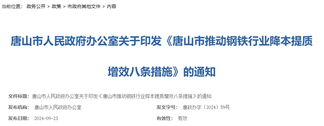 9月23日,唐山市人民政府網站發布了關于印發《唐山市推動鋼鐵行業降本提質增效八條措施》的通知(以下簡稱《通知》)。