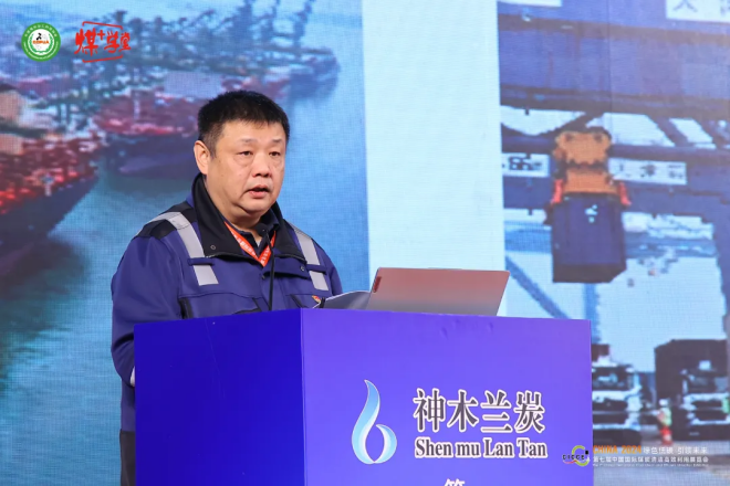 天津港焦炭碼頭有限公司總經理高偉為與會代表做題為《港口在貿易環節的作用及天津港蘭炭貨類港口業務功能》的報告。