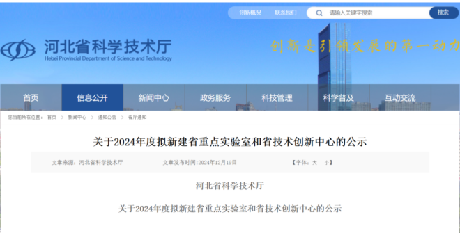 12月19日,河北省科學(xué)技術(shù)廳網(wǎng)站發(fā)布《關(guān)于2024年度擬新建省重點實驗室和省技術(shù)創(chuàng)新中心的公示》,共有48個2024年度擬新建省重點實驗室和135個2024年度擬新建省技術(shù)創(chuàng)新中心,公示期為2024年12月19日起至12月25日。