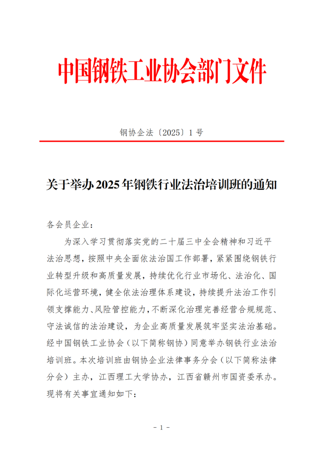 關于舉辦2025年鋼鐵行業法治培訓班的通知