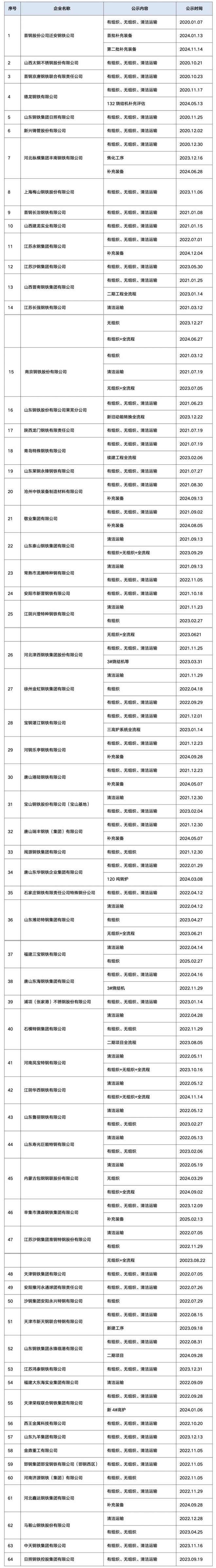 自2020年8月起,中國鋼鐵工業協會開展了鋼鐵企業超低排放改造和評估監測進展情況公示工作。截至目前,已有183家企業在鋼協網站進行公示。已公示企業名單匯總及各企業公示內容整理如下: