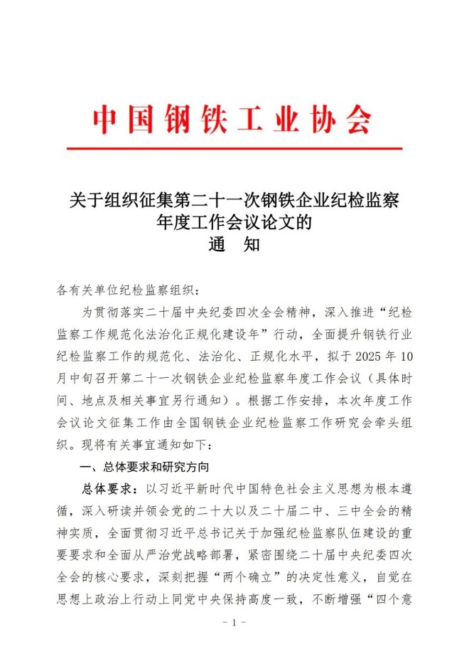 關于組織征集第二十一次鋼鐵企業紀檢監察年度工作會議論文的通知