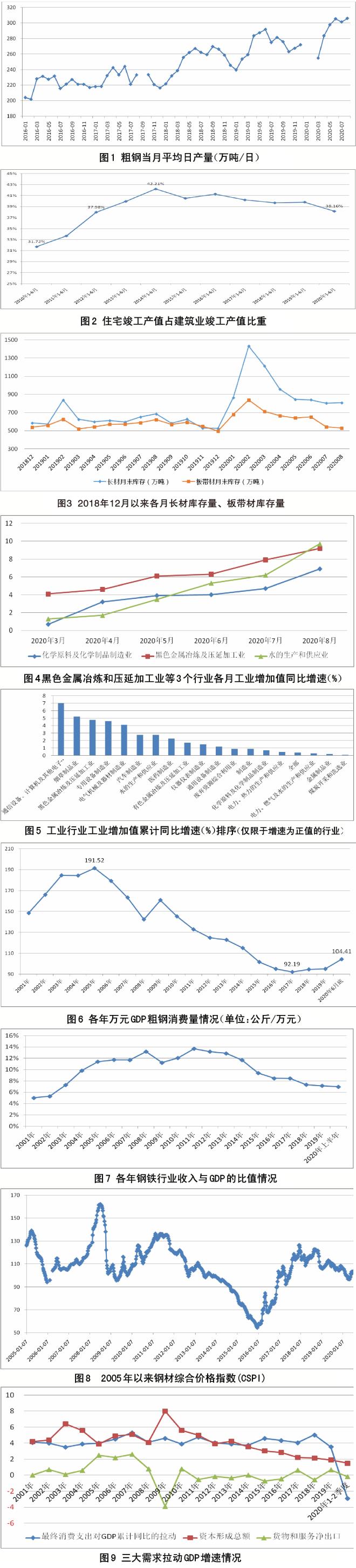 同時,我們要看到,2020年上半年,萬元GDP粗鋼消費量較2019年提高了9.32公斤/萬元,增長幅度達9.81%,這意味著2020年固定資產(chǎn)投資中的“萬元建筑安裝投資額”對鋼材的消費量強度較2019年提高了10%左右。這也是2020年上半年鋼鐵行業(yè)面對新冠肺炎疫情沖擊,粗鋼產(chǎn)量得以逆勢增長且支撐國民經(jīng)濟在第二季度實現(xiàn)快速反彈的重要原因。