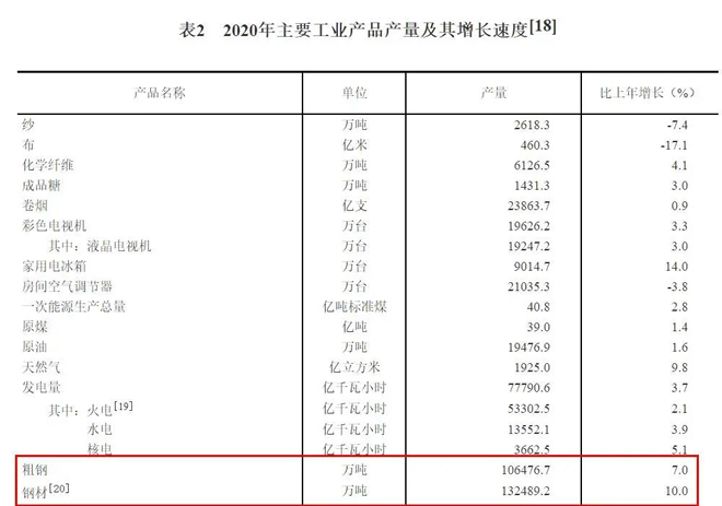 《公報》顯示,2020年我國黑色金屬冶煉和壓延加工業工業增加值比上年增長6.7%。2020年,我國粗鋼產量為106476.7萬噸,比上年增長7.0%;鋼材產量為132489.2萬噸,比上年增長10%。