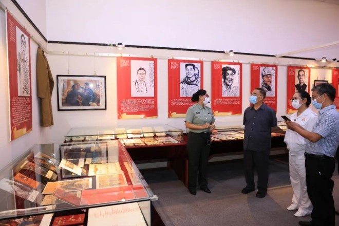 時代記憶館第一展區的展板是1951年在中國國家展覽館展出過的原始展板。張伯禮院士看到毛澤東主席在湖南第一師范刊印的《明恥篇》封面上的題詞時,靜靜地摘下眼鏡,走近端詳,感懷頗深。作為一名老黨員,在回顧崢嶸歲月、英雄事跡、偉人情懷時,張伯禮院士深受觸動。