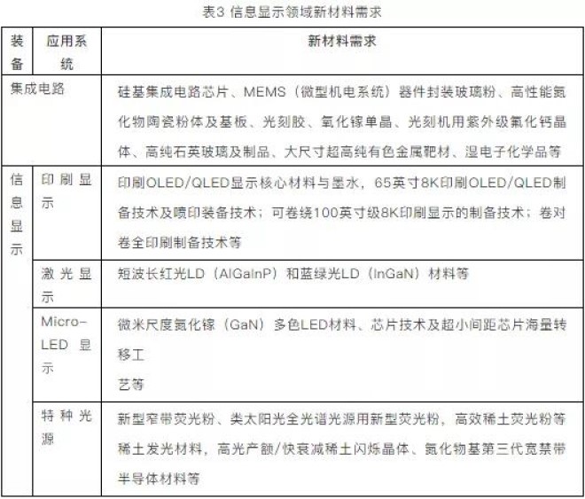 集成電路與信息顯示是我國電子信息產業的兩大基石,是信息領域為數不多的千億美元級產業,帶動力和輻射力極強,在我國國民經濟中占有極其重要的戰略地位,信息顯示領域新材料需求見表3。新型信息技術及產業的發展需要電子信息材料支撐,當前我國電子信息材料研發技術與發達國家存在較大差距。