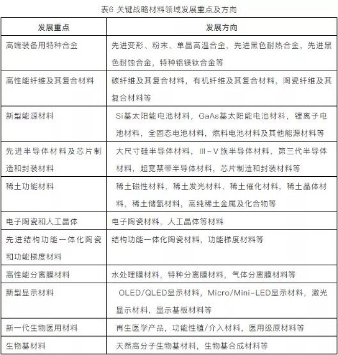關鍵戰略材料領域發展重點及發展方向主要包括高端裝備用特種合金、高性能纖維及其復合材料、新型能源材料、先進半導體材料及芯片制造和封裝 材料、稀土功能材料、電子陶瓷和人工晶體、先進結構功能一體化陶瓷和功能梯度材料、高性能分離膜材料、新型顯示材料、新一代生物醫用材料及生物基材料等(見表6)。