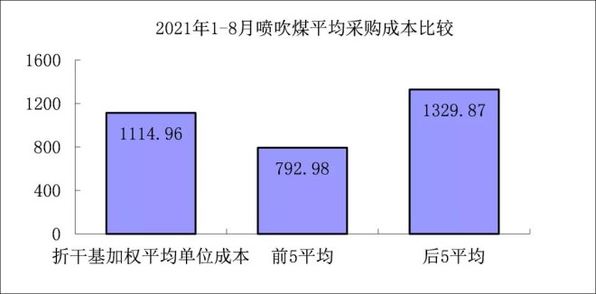 1-8月對標(biāo)企業(yè)噴吹煤平均采購成本最低的前5家企業(yè)折算成干基的加權(quán)平均采購成本為792.98元/噸,比對標(biāo)企業(yè)平均采購成本低321.98元/噸,低于平均采購成本28.88%;而采購成本最高的5家企業(yè)的加權(quán)平均采購成本為1329.87元/噸,比對標(biāo)企業(yè)平均采購成本高214.92元/噸,高于平均采購成本19.28%。