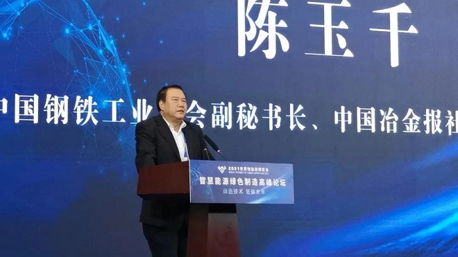 圖為中國(guó)鋼鐵工業(yè)協(xié)會(huì)副秘書長(zhǎng),中國(guó)冶金報(bào)社黨委書記、社長(zhǎng)陳玉千為智慧能源綠色制造高峰論壇“雙碳”目標(biāo)驅(qū)動(dòng)冶金行業(yè)高質(zhì)量發(fā)展分論壇致辭