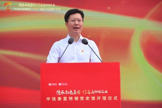 活動現(xiàn)場,黨徽閃耀,嘉賓云集,氣氛熱烈。中信集團(tuán)黨委書記、董事長朱鶴新,中國鋼鐵工業(yè)協(xié)會黨委書記、執(zhí)行會長何文波,中信集團(tuán)黨委副書記、總經(jīng)理奚國華,黃石市委書記郄英才,黃石市委副書記、市長吳之凌,中信集團(tuán)黨委委員、副總經(jīng)理王國權(quán),中信集團(tuán)黨委委員、副總經(jīng)理徐佐等領(lǐng)導(dǎo)出席活動。何文波受邀在“中共大冶鋼鐵廠支部”成立100周年大會上講話,并為中信泰富特鋼黨史館揭幕。