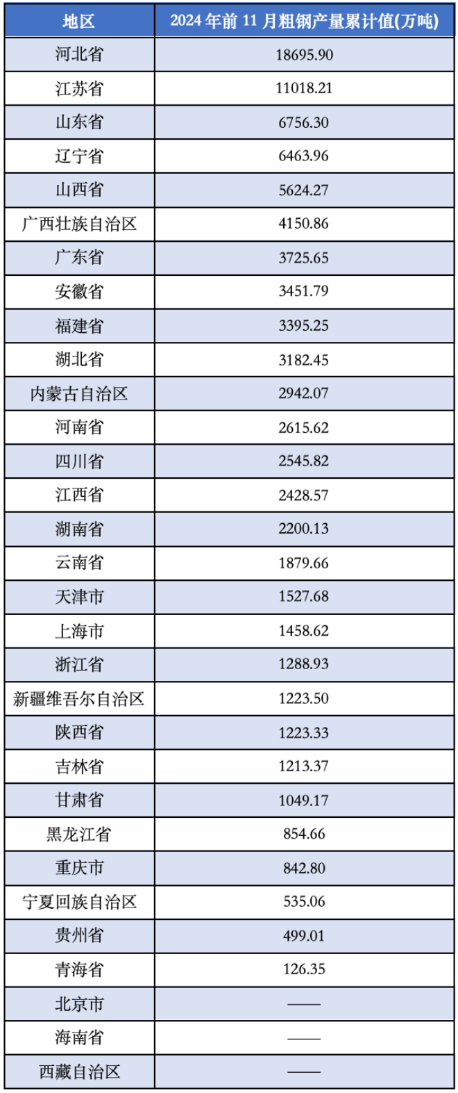 從地區(qū)來看,2024年前11個(gè)月,我國粗鋼產(chǎn)量排名前5位的省份分別為:河北省(18695.90萬噸)、江蘇省(11018.21萬噸)、山東省(6756.30萬噸)、遼寧省(6463.96萬噸)、山西省(5624.27萬噸)。具體情況見下表: