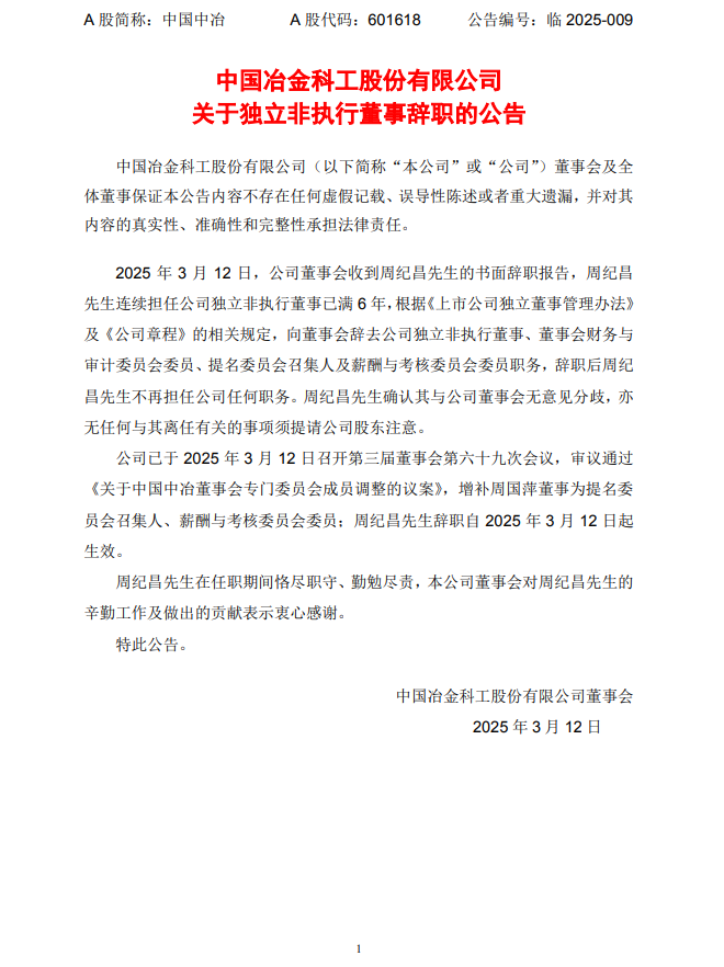 中國(guó)中冶:中國(guó)中冶關(guān)于獨(dú)立非執(zhí)行董事辭職的公告
