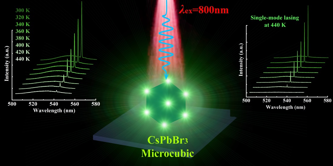 窄線寬、超高品質的單模納米激光器在物理和工程方面有著諸多應用潛能,如片上光學集成、相干探測以及量子信息處理等。而全無機鈣鈦礦CsPbBr3半導體材料作為一種高增益材料受到了廣泛的關注與研究。但是,熱穩定性差一直是限制該材料的最大問題。目前,絕大多數鈣鈦礦微腔只能在室溫甚至是低溫下才能獲得激射,這極大限制了高功率集成光電子設備以及鈣鈦礦電泵浦激光器的應用。因此,提升鈣鈦礦微腔的熱穩定性,從而獲得穩定的高品質因子的單模激光輸出是一個亟待解決的問題。
