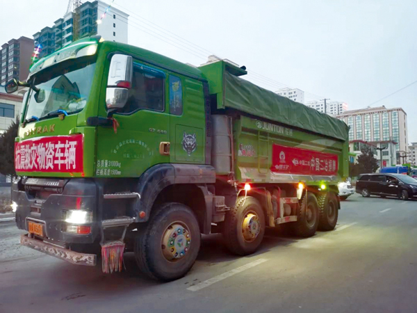 圖為中國二冶為災區運送捐贈物資的車輛。