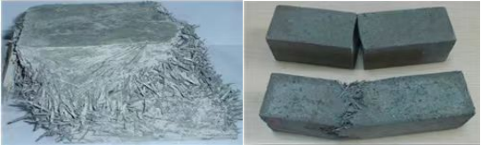 爐腹爐腰預掛渣皮技術是將金屬陶瓷材料澆注與冷卻壁表面,在冷卻壁表面形成一層永久性的人造渣皮保護層。該材料將金屬纖維引入到非金屬澆注料種,將兩者的優點相結合,提高材料的抗折抗壓等物理指標,提高材料的導熱能力,延長爐腹、爐腰區域耐材的使用壽命。在350℃條件下,導熱系數20W/(K·m)左右;鋼纖維含量達到40%左右,不是普通的高鋼纖維澆注料(10%以下),其200℃以下抗折強度可達到35MPa~40MPa,在實驗室常規抗折檢測設備都無法將其壓彎,而折后的材料也不“折而不斷”。下圖為預掛渣皮材料的物理檢測圖。