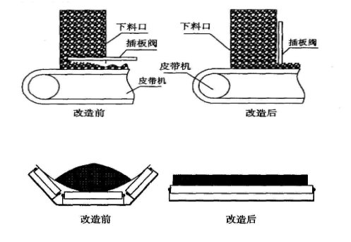 為了提高燃料破碎質量合格率,改善燒結礦的產質量、降低燒結礦的固體燃耗。工作室成員決定對燃料破碎系統進行技術改造,將受料口加寬至約與皮帶同寬,并將下料口插板改為豎直式,這樣燃料可以落滿至皮帶上,燃料下料方式成為平鋪拉料式,隨著皮帶的運行,將燃料拉出,并且只要調整插板開度即可調整其在皮帶上的布料厚度,皮帶則改為由一個水平托輥支撐。