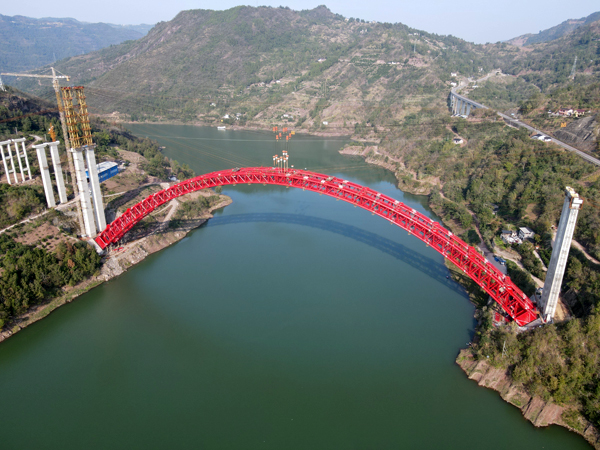 圖為江龍高速公路項目磨刀溪特大橋主橋拱肋順利合龍后的場景。 (中國十九冶 供圖)